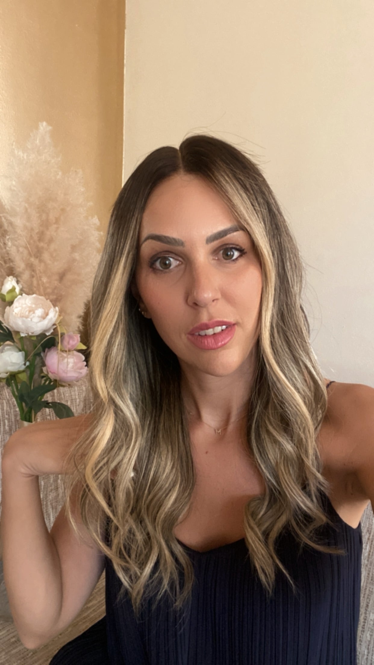 Diana je plava perika od prirodne kose s tamnijim, smeđim korijenom koji stvara izražen kontrast prema svjetlijim, pepeljastim pramenovima. Visoki balayage prijelaz i gusti, naglašeni pramenovi daju snažnu dimenziju boji i upečatljiv vizualni efekt kroz cijelu dužinu. Kontrast tamne baze i svijetlih tonova stvara dinamičan, višeslojan izgled bez ravnih prijelaza.